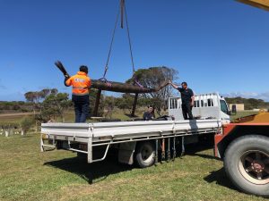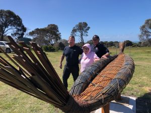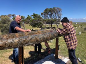 Engineering support from Ray Massie ensured a strong foundation, with Matt Cameron and the Tebrakunna Rangers pouring the concrete slab. Installation was made possible by Woolnorth Wind, whose team—Tony Saunders, Adam Hall, and Matthew Irwin—expertly placed the canoe on its footings with the help of a crane.