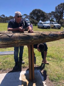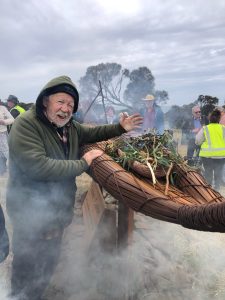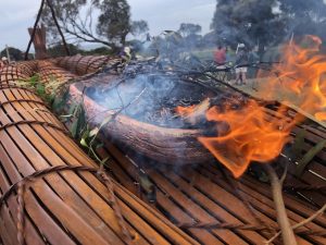 Uncle Sammy and brother Leslie guided us in this sacred duty of making the welcoming smokes that let us rest Timme in country – to breathe the gumleaf air as Timme once did – we know that in bringing Timme home, we have bound ourselves together in love, kinship and reciprocity, just as the wires are woven together to bind the canoe.